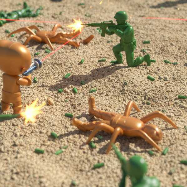 These are the fake Army Men that form when a Space Alien Spider assimilates an Army Man. They usually take on the color of the assimilated Plastic Soldier and replicate its shape almost perfectly. However, they have serious difficulties replicating their faces. Instead, their faces are a horrifying mix of Plastic Soldier and Space Alien.