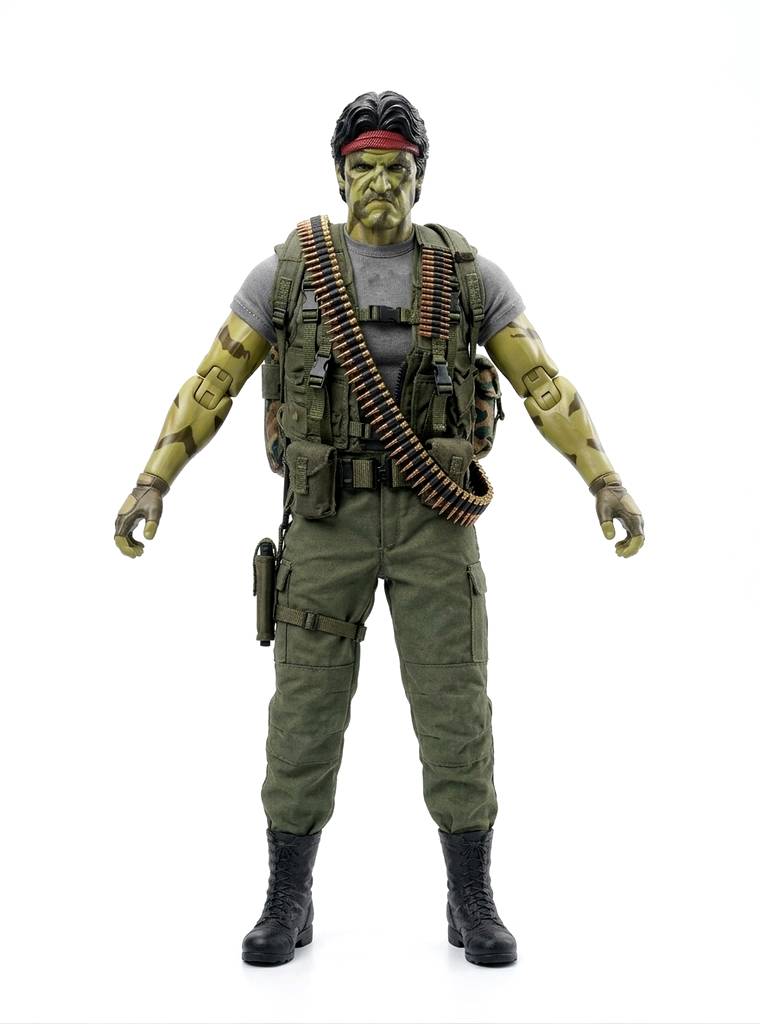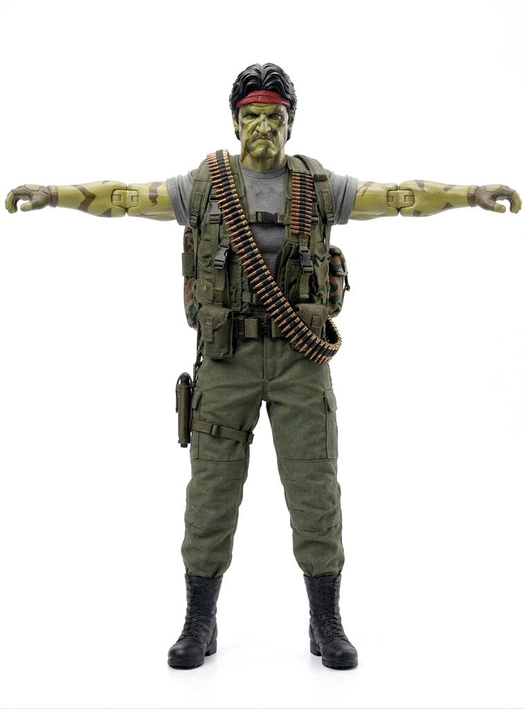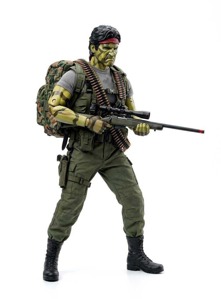 The Commando’s appearance is that of a seasoned soldier, heavily inspired by Real World military archetypes. He carries detailed gear: a tactical vest, ammunition belts, combat boots, a backpack, and a variety of weapons. His face is expressive compared to molded soldiers, capable of conveying tension, aggression, and violent intent.
