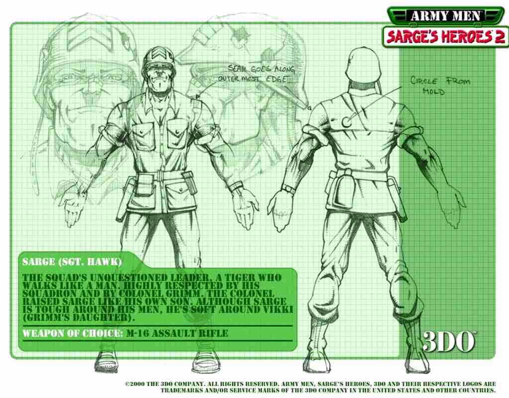 Over the years, the different generations of Army Men have changed in hue. From the Olive Green in Army Men 1, to the English Green in Army Men 2, to the Apple Green in Army Men: Sarge’s Heroes. Even in Army Men: Sarge’s Heroes 2 on Playstation 2 we could see plastic soldiers of different shades within the Tan. So it will be a thing in our project.