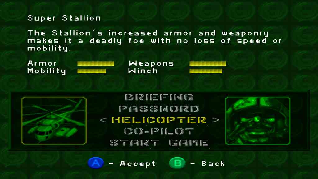 Super Stallion CH-53E Super Stallion The Super Stallion is the best of both worlds. It is fast, has powerful weaponry and can carry heavy loads without taking a huge performance hit. It comes with a heavy compliment of armor as well. Sources for this article: Army Men Air Attack official website (Internet archive)