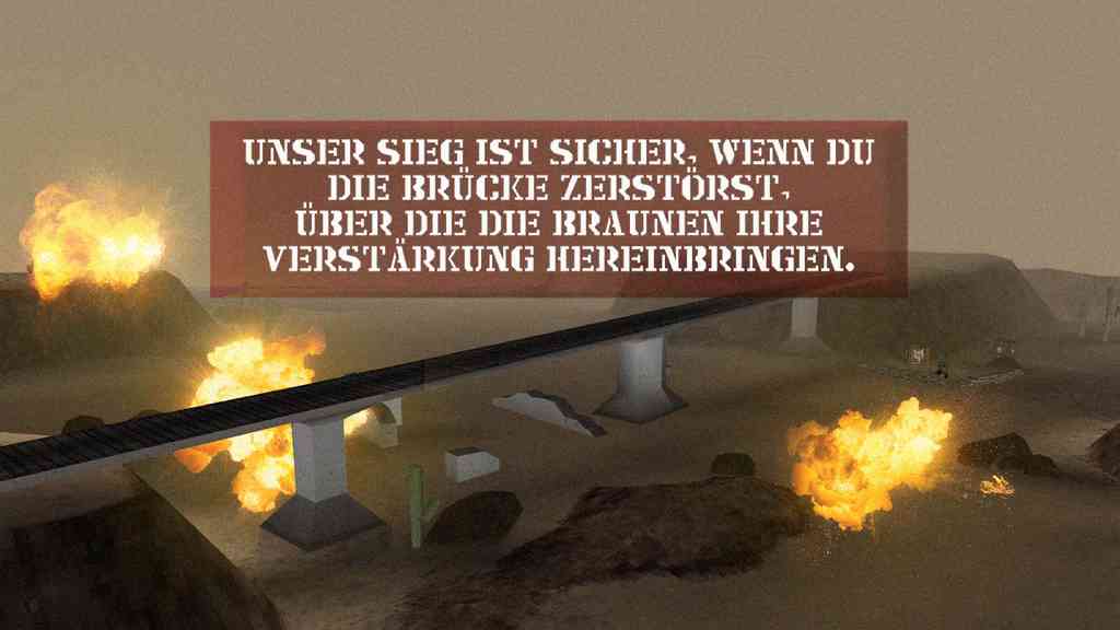 Once the Colonel was safe, about to enter in the Half-Track that will extract him, he gave Sarge the third Key and information about its power. But the Colonel could get to the safe house because the road was blocked for vehicles. So Sarge and The Colonel proceed on foot, fighting his way across the Bridge leading to the location.