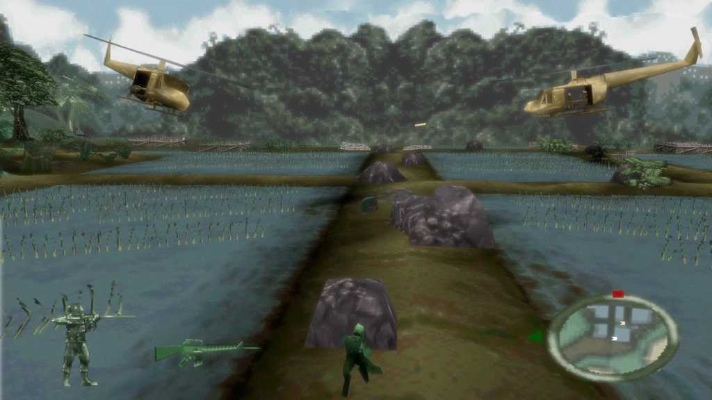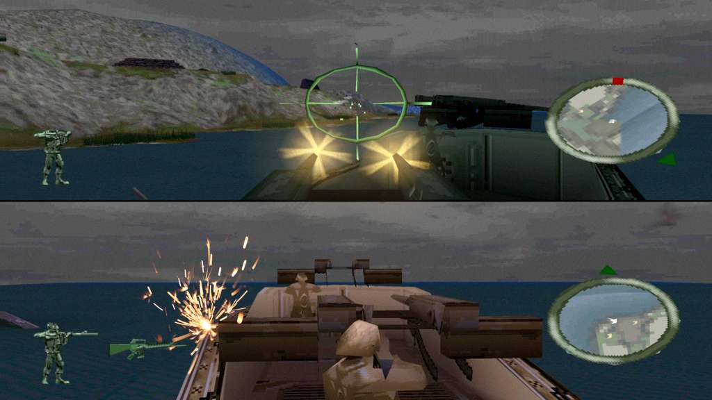 - Multiple mission objectives — Take out a supply train on a mountainside, launch a bombing mission to save an airport from attack, capture a Tan border city, command choppers to rescue your men, battle Tan troops on the shore from your PT boat.
